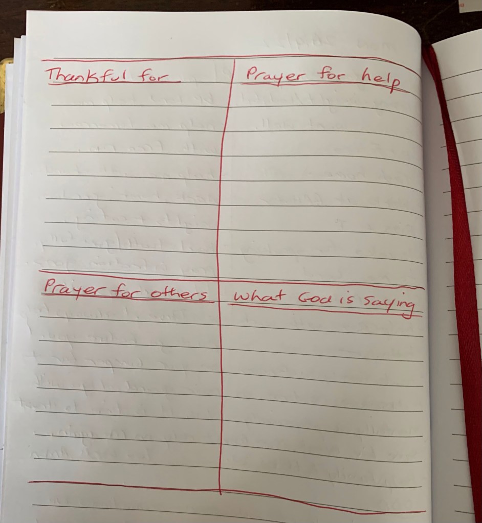 I draw a cross so I make four boxes. In each box I write a heading – things I am thankful for, prayers for help (for me), prayers for others, and what God is saying. I find it has a way of balancing your prayers for yourself and for others.