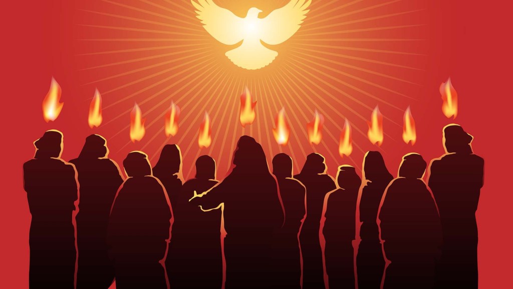 [1] On the day of Pentecost all the believers were meeting together in one place. [2] Suddenly, there was a sound from heaven like the roaring of a mighty windstorm, and it filled the house where they were sitting. [3] Then, what looked like flames or tongues of fire appeared and settled on each of them. [4] And everyone present was filled with the Holy Spirit and began speaking in other languages, as the Holy Spirit gave them this ability.